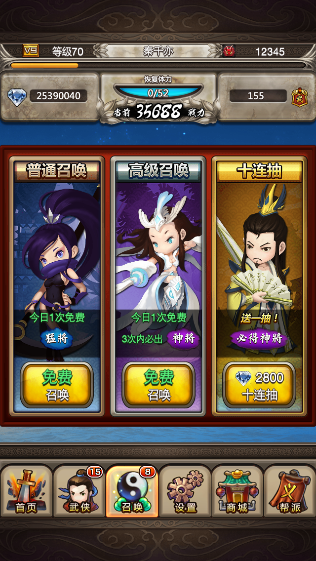 三种召唤均需使用钻石,每天都有一定的免费召唤次数,其中高级级召唤花费较多,召唤出来的英雄品质也更高。以下两张图分别为武侠召唤界面、召唤特效界面。