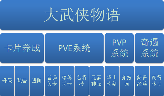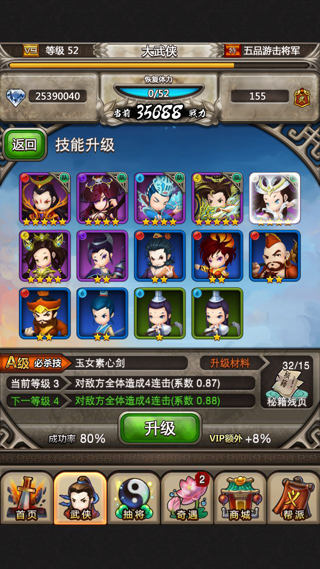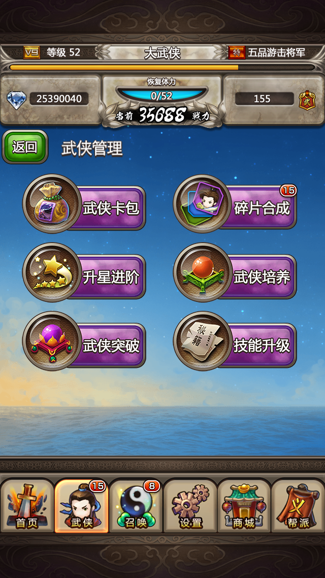 点击主界面下方的“武侠”按钮可以进入武侠管理界面,武侠管理界面包含了跟卡片培养相关的所有功能的入口,点击各个入口即可进入对应的培养界面。