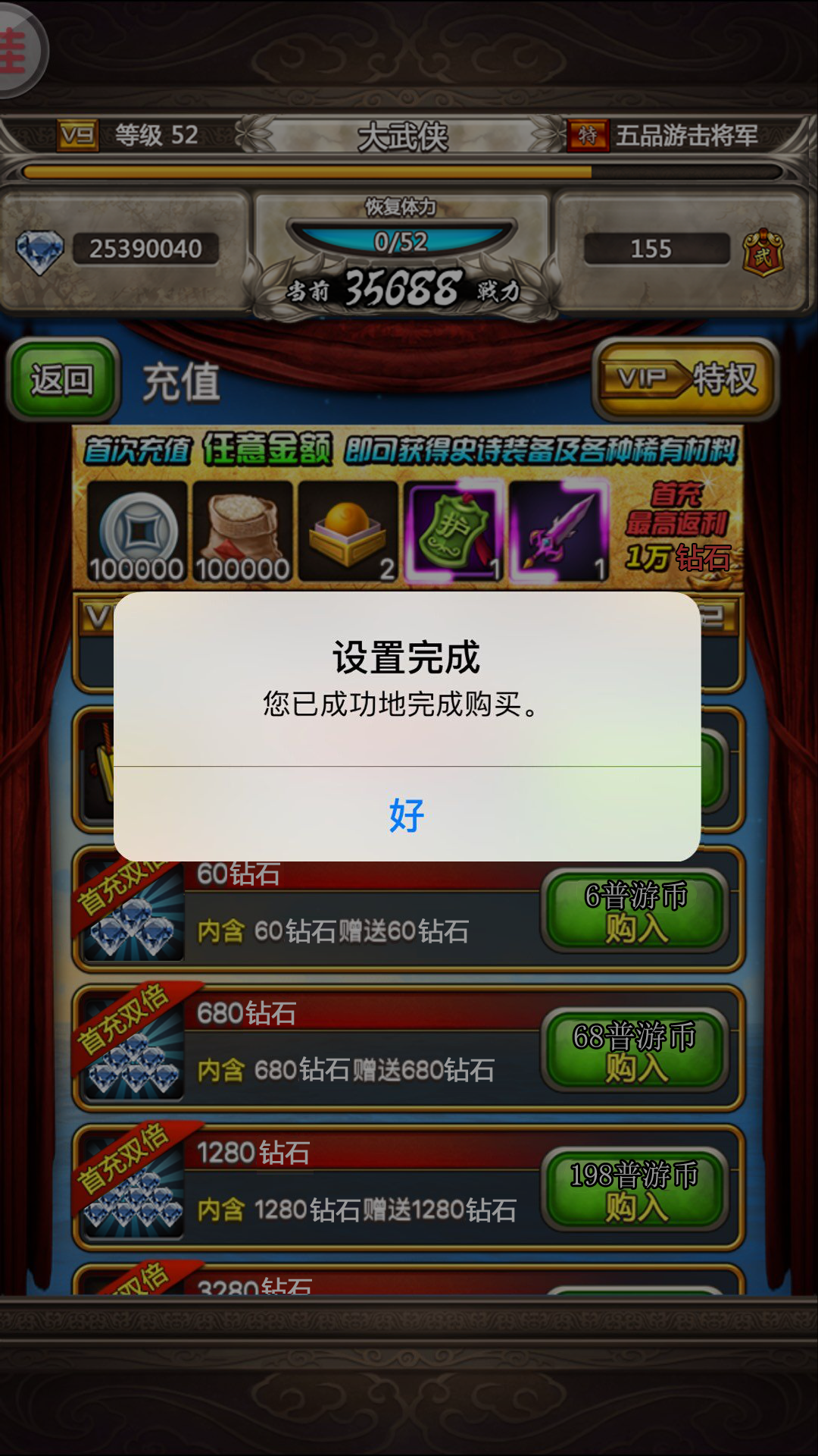 选择对应档位,支付成功后完成充值,获得对应钻石