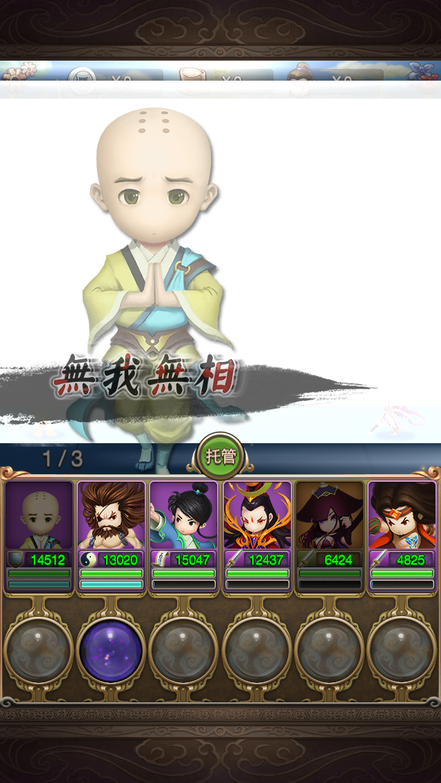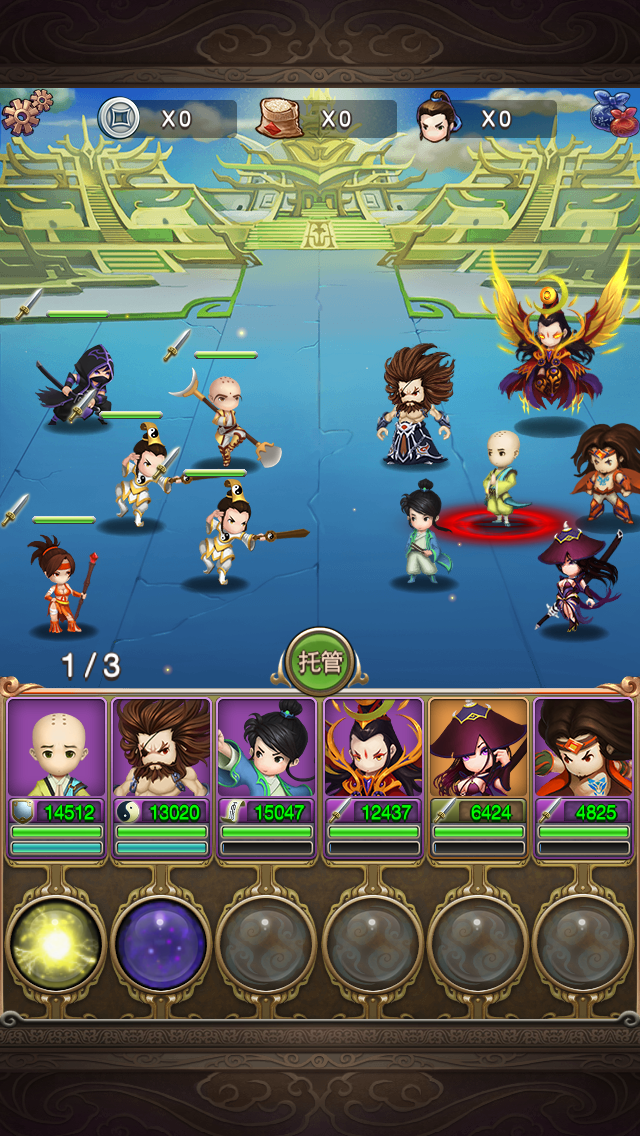 稍靠下的部分是主战斗区域,玩家自己的英雄显示在右侧,敌人显示在左侧,战斗中发生的打斗动画、技能动画都在这一区域显示。玩家把左侧所有敌人打倒即算战斗胜利。