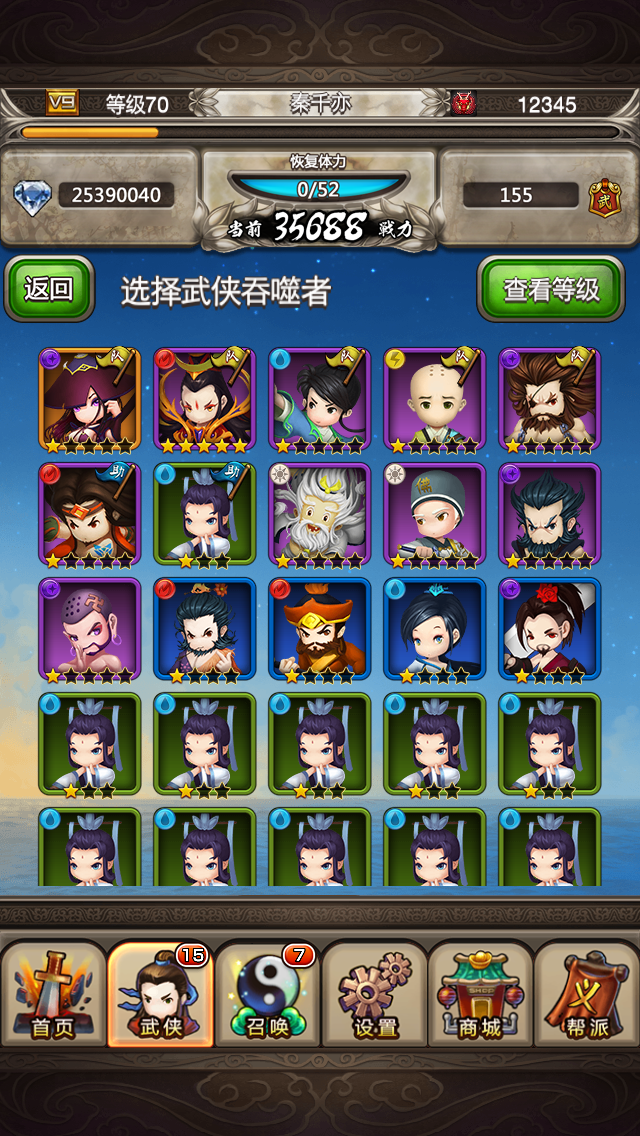 武侠一览界面用语显示玩家所拥有的所有英雄,在此界面中长按某个英雄头像可以查看英雄详细信息,点击英雄头像可以选中英雄,对英雄进行出售操作。