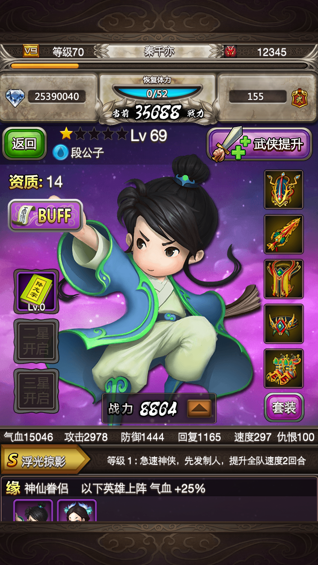点击主界面下方的“武侠”按钮可以进入武侠管理界面,武侠管理界面包含了跟卡片培养相关的所有功能的入口,点击各个入口即可进入对应的培养界面。