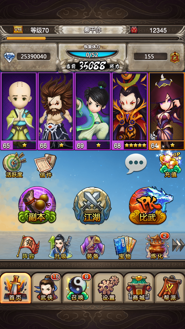 中间部分是主界面的主要操作区域。在靠上部分显示的是玩家当前处于出战状态的队伍中的队员头像和所属的元素属性,中间部分的”征战江湖”按钮是PVE战斗的入口,活跃度是日常活动的入口,在信件中可以查看各类系统邮件和系统奖励。