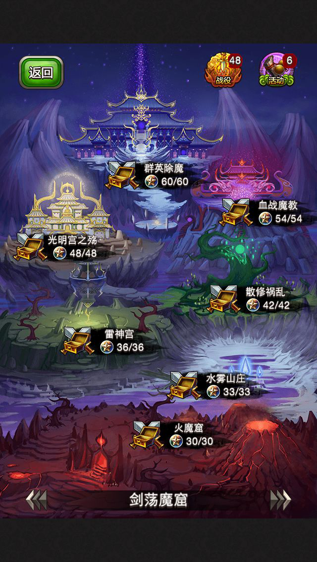 在每张地图上有若干章节,章节根据剧情布置,每个章节都会有一个元素属性,代表章节中关卡中怪物的主要元素属性,玩家需要根据元素的相生相克原理来合理配置自己的阵容,才能轻松的打通章节。
