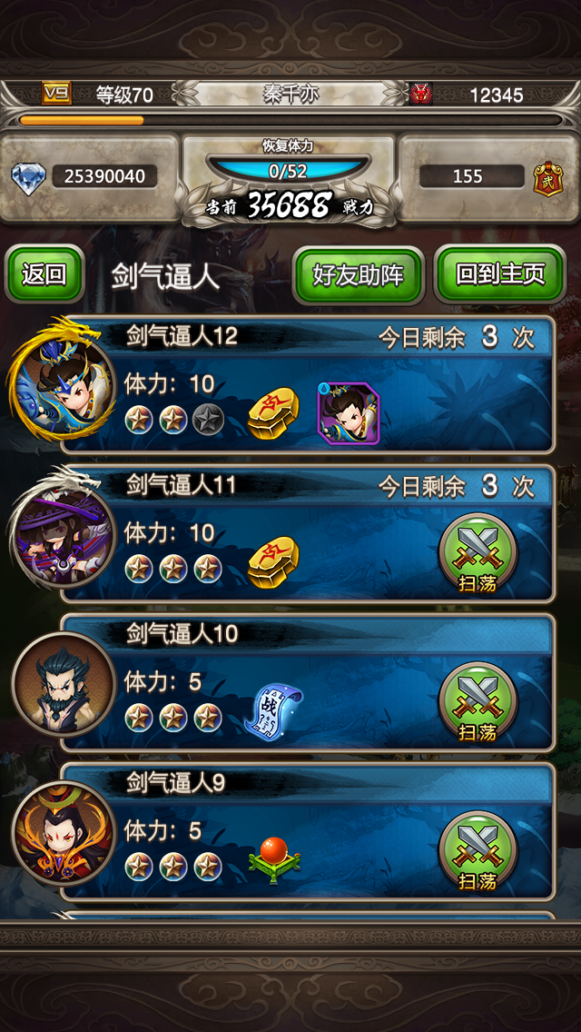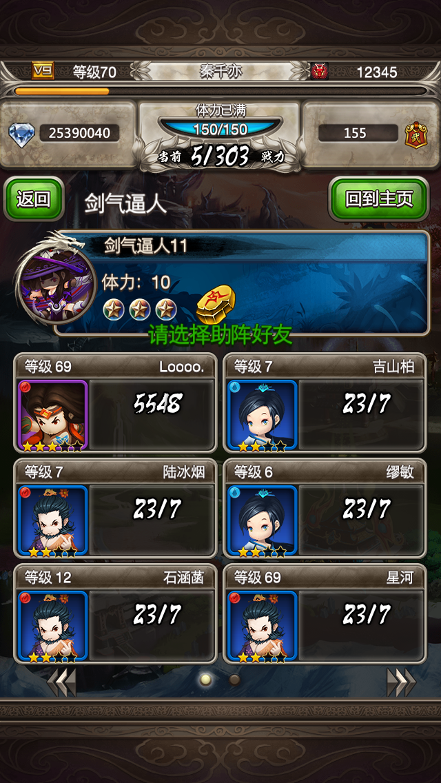 以下三张图分别为地图、关卡选择、助战队友选择界面。
